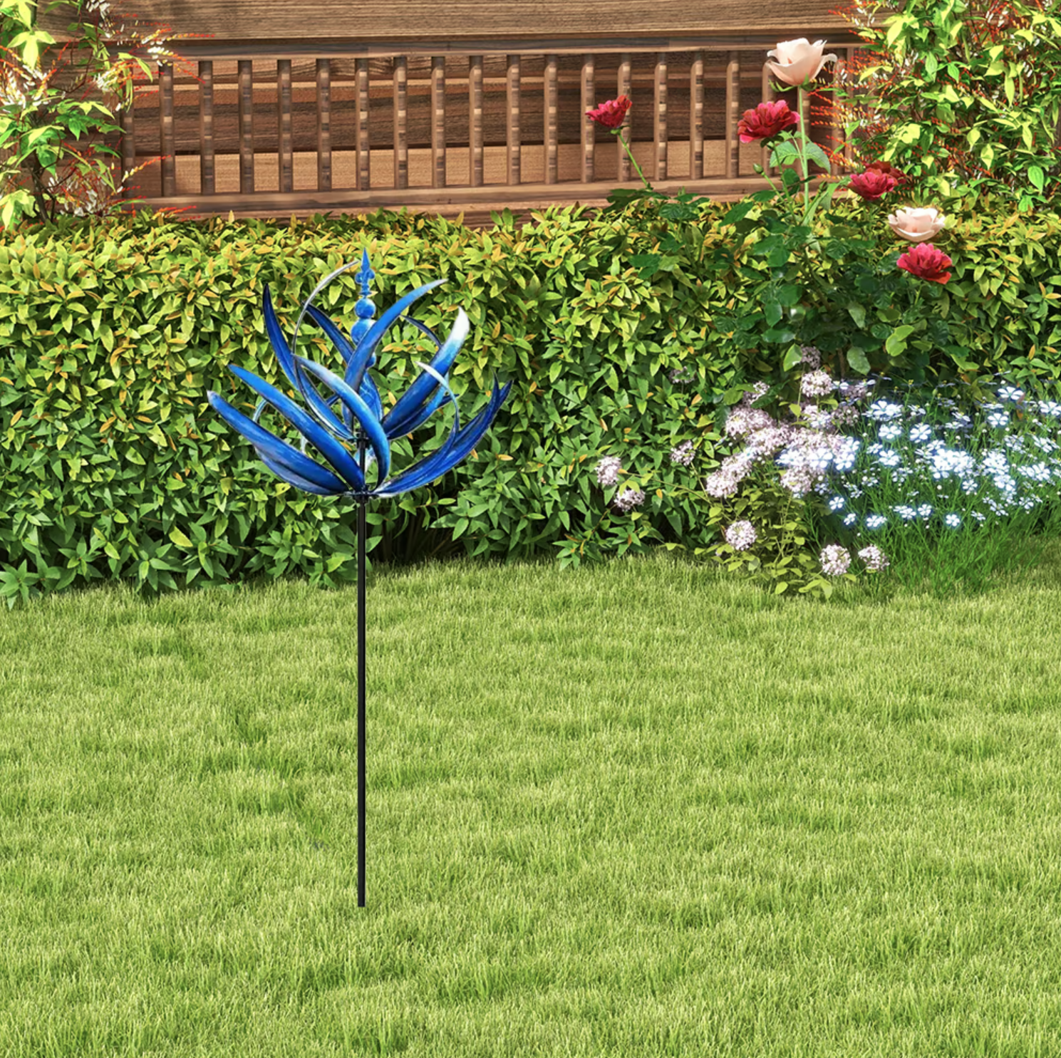 ć Lovely Blue Finish ćAdd a touch of color and elegance to your garden with this metal wind spinner that has a lovely blue finish that shines in the sun. It has a stunning lotus design that rotates smoothly in any direction with 360 degrees of rotation, captivating your eyes.